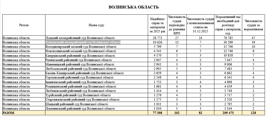 На сайті Ради суддів України опублікувано оновлену інтерактивну карту з орієнтовними розрахунками нормативів навантаження на суди та суддів з урахуванням кількості справ, які розглядалися судами за 2025 рік.